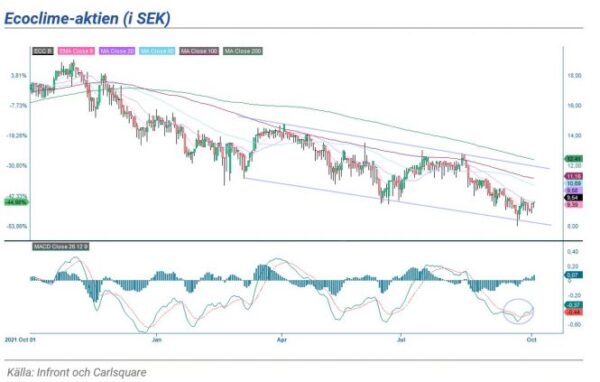 Trots ett starkt orderflöde har Ecoclime-aktien likt resten av aktiemarknaden hittills haft ett tungt år. Sedan årsskiftet är aktien ned cirka 36 procent medan OMXSPI har tappat cirka 31 procent. Som framgår i graf nedan handlas Ecoclime vid golvet på en fallande trend. Samtidigt syns också hur den snabba EMA9 vänt upp. Parallellt har MACD genererat en svag köpsignal som i sin tur indikerar att momentum är på väg att vända. Med andra order kan vi ha sett botten i aktien.